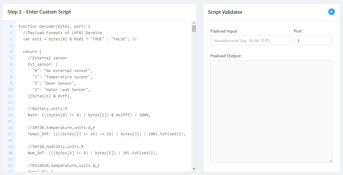 Next we need to enter the JavaScript that will decode our payloads for us. The Script Validator allows you to easily test inputs in hexadecimal form to ensure that your script will run successfully.