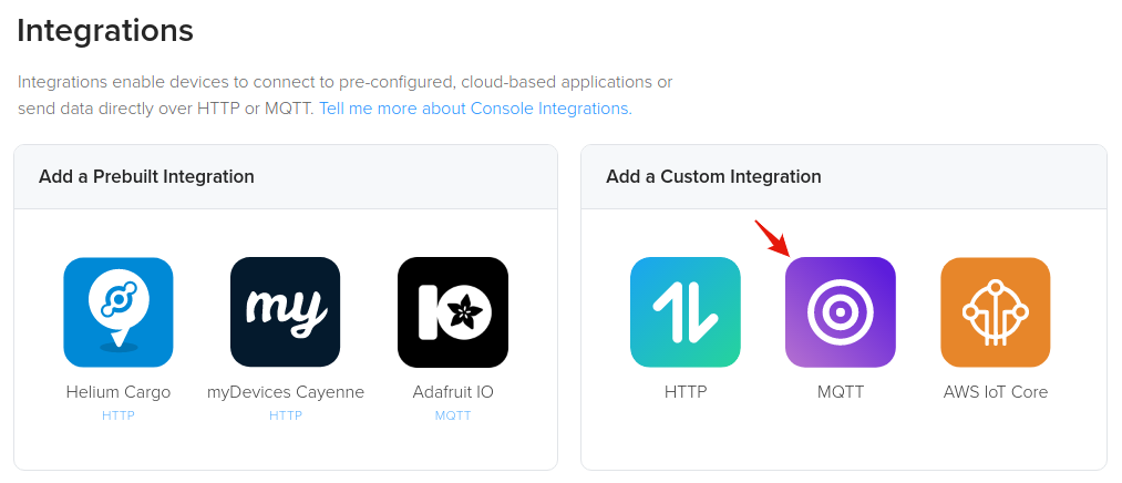 To add an integration, go to Integrations on the left-hand menu. Select the integration to add - in this case, the MQTT integration.