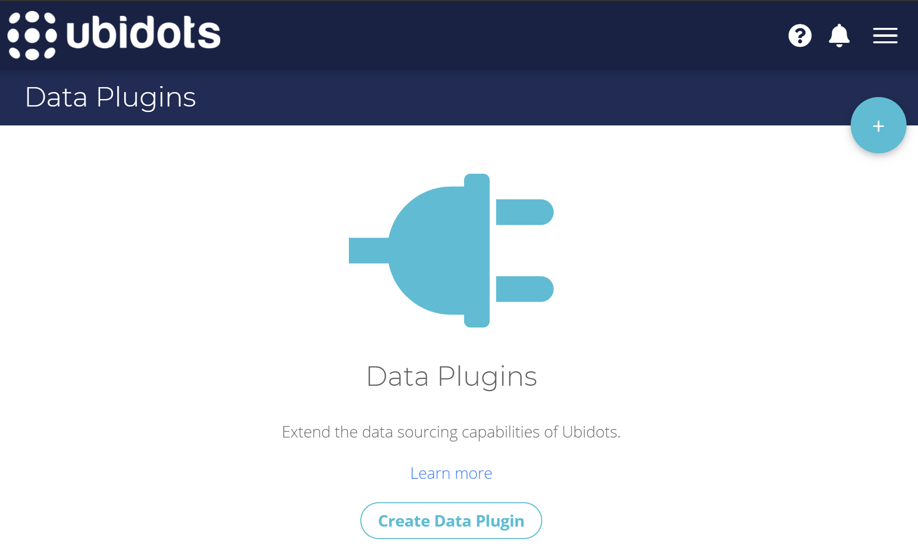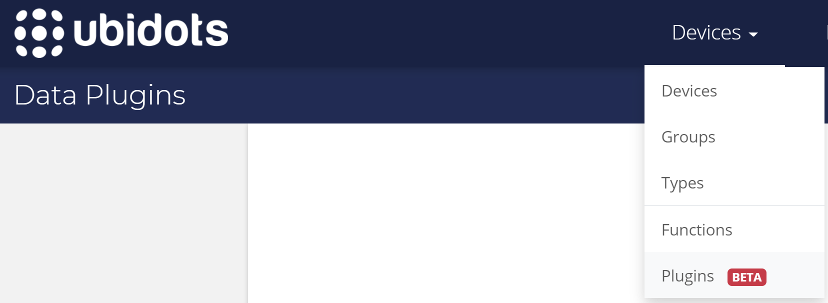 To get started, log in to your Ubidots account and select Plugins from the Devices dropdown menu at the top of your screen: