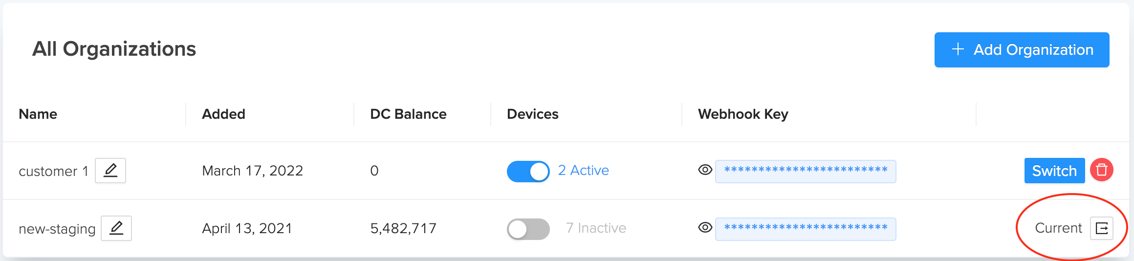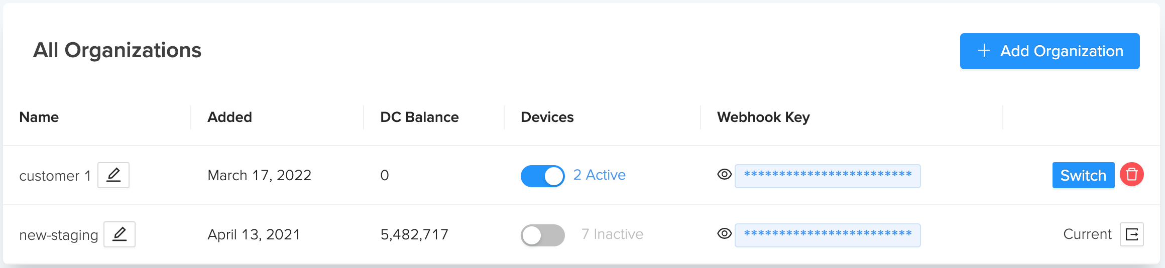Users can add additional Organizations by navigating to the Dashboard page using the left side navigation, and then click + Add Organization in the upper right. To switch to another Organization click the Switch button on the list of Organizations on the Dashboard page.