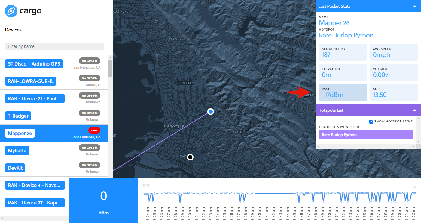 You can also click on the RSSI box shown below to view a time series view again, but with the signal strength and Hotspot that received each packet.