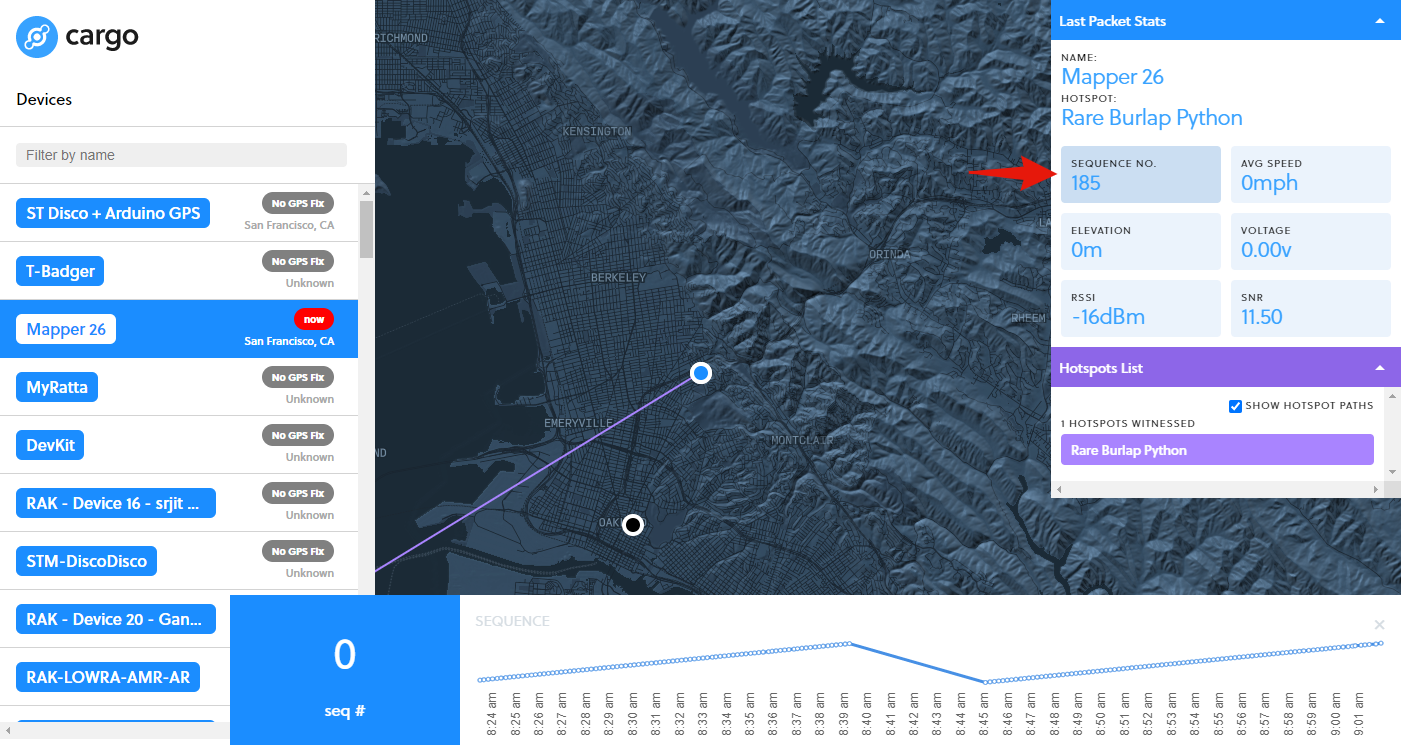 When you click on your device on the left, you will see a details window pop up in the right top of the window. Here you can click on the Sequence No box shown below to get a time series view of each packet that was received in sequence as well as the Hotspot that received it. The sequence number should match the UL Count on the Packet Count screen shown on the device, although it will likely be a few seconds delayed. The sequence number will start from zero after each power cycle of the device.