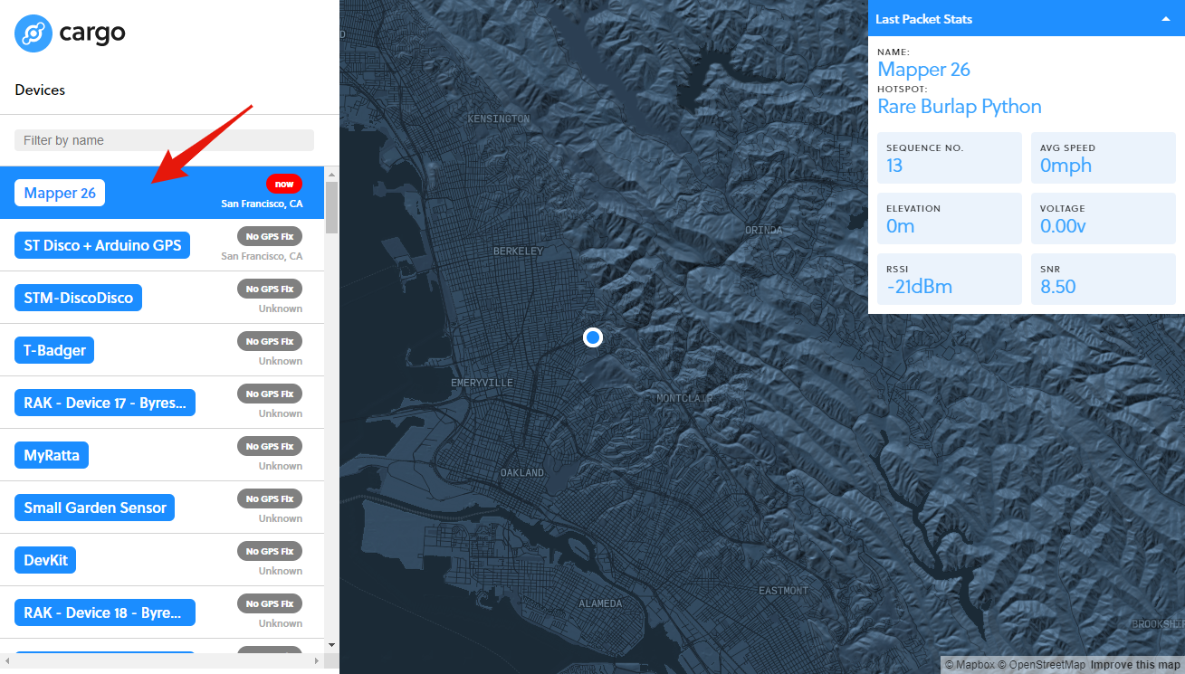 When your device is transmitting packets with a valid GPS fix your device will be visible on cargo.helium.com. The device names are in the format of Mapper #, with the number being that which is displayed on the front of your device with a label as shown below. The Avg Speed, Elevation, and Voltage will always show zero, as these values were not included.