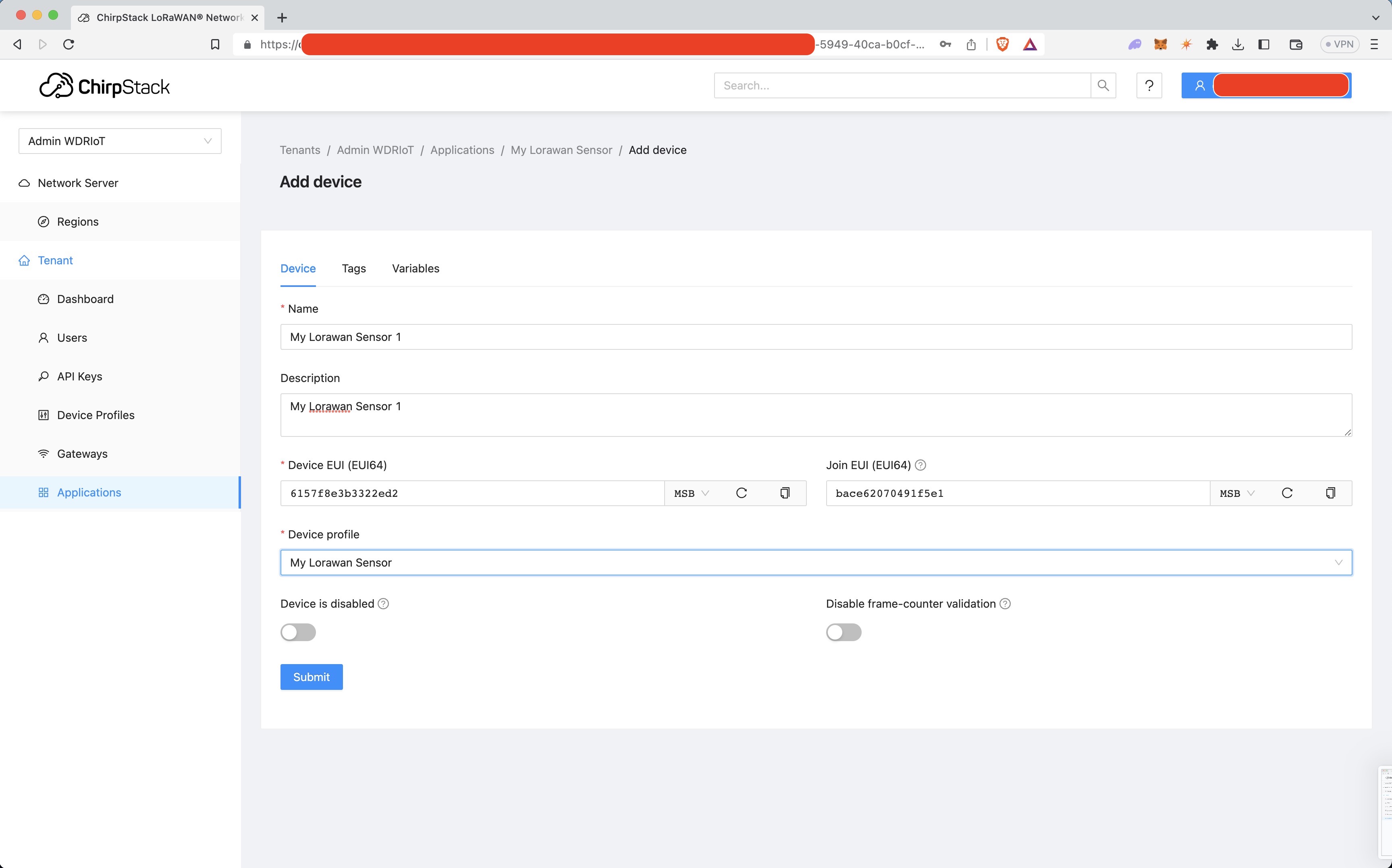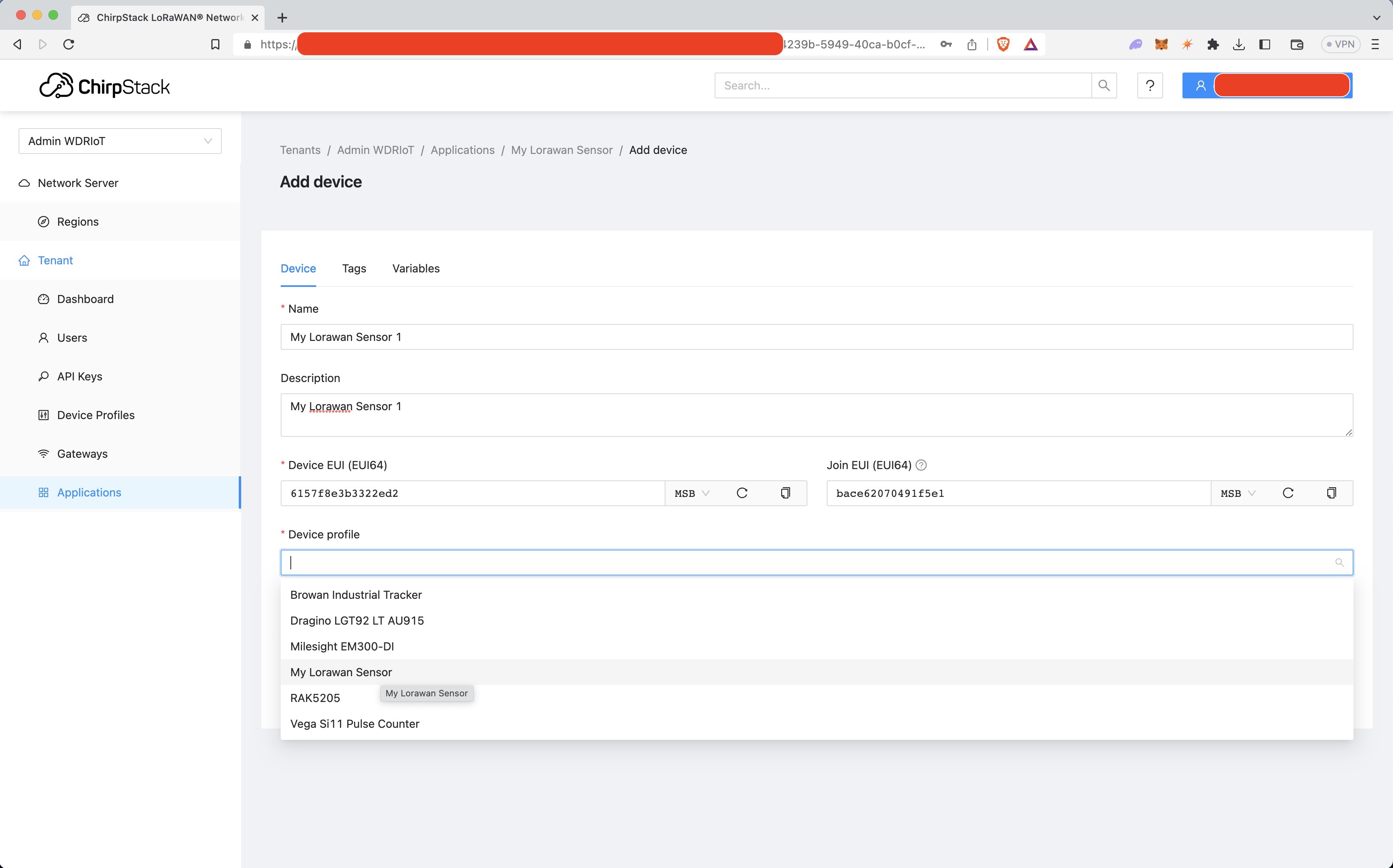 Fill in your device details and select the device profile you made earlier. A Device EUI can be
