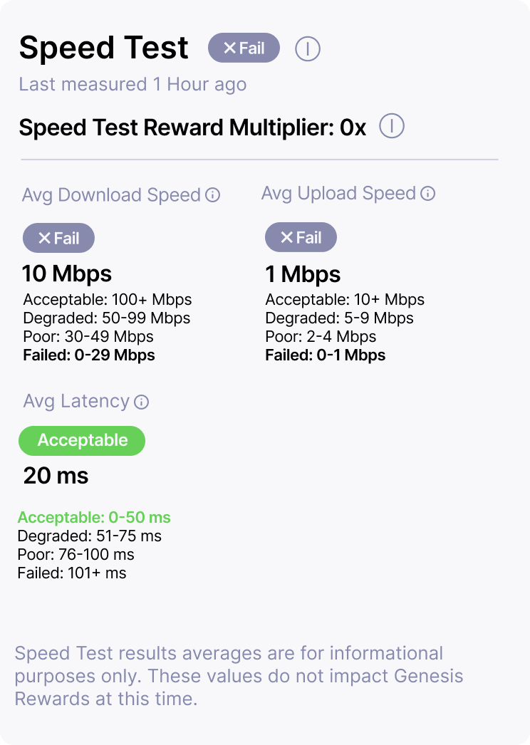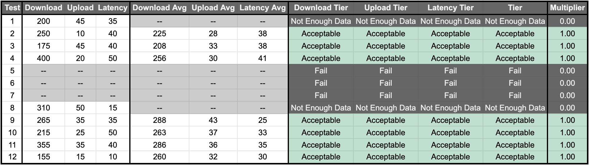 | Fail | 0.00x | <30 Download, OR <2 Upload, OR >100 Latency |