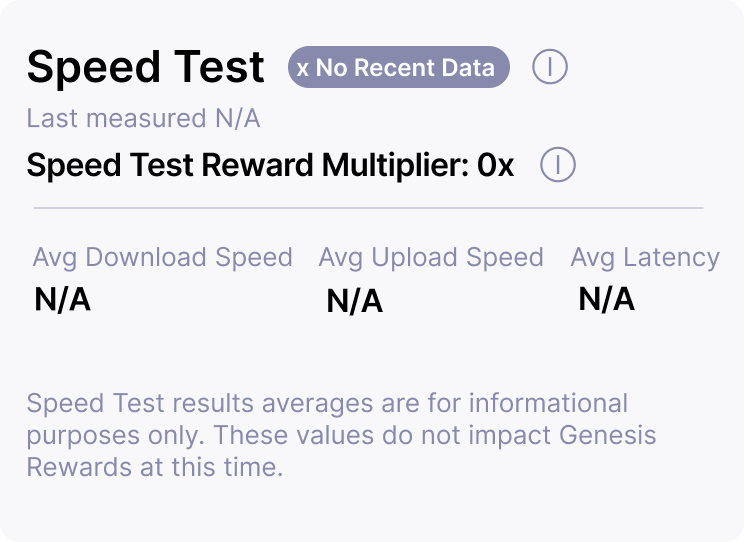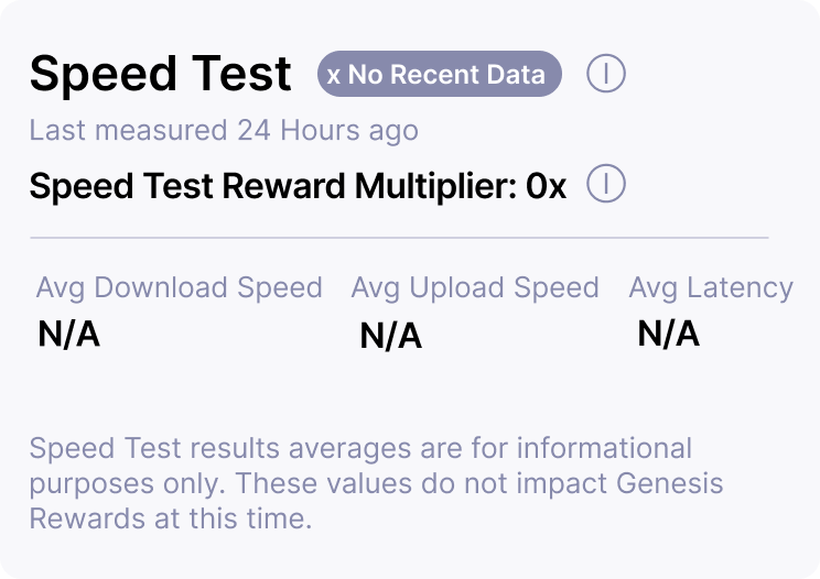 This status appears when a Speed Test could not be performed in the previous 24 hours. For example, when a 5G Hotspot has recently recovered from a prolonged network interruption, power interruption, or other connection interruptions have occurred.