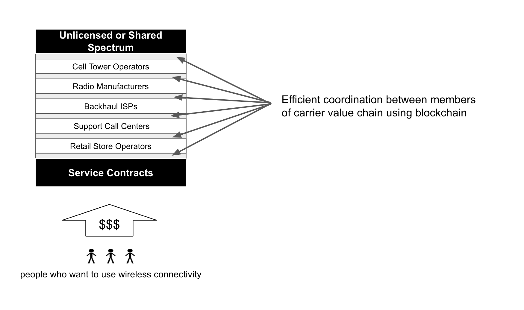 While the value chain endpoints do not significantly change, participating Service Providers can use blockchain technology to streamline the coordination of the layers in delivering useful coverage to subscribers.