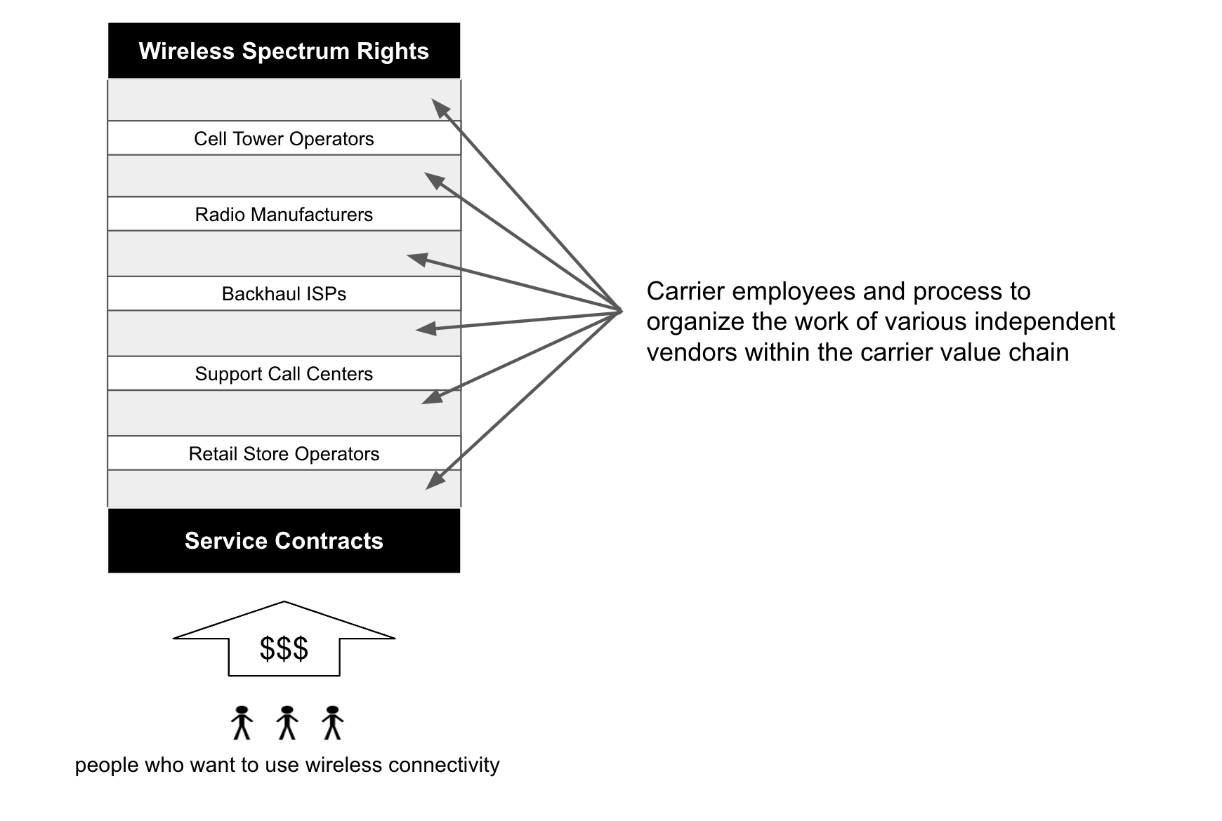 With so many operational aspects of the business outsourced, the competitive advantage of a carrier reduces to two critical assets over which they have direct ownership: spectrum lease contracts and service contracts with subscribers. Everything else – all of the coordination of people and infrastructure described above – is dedicated to bridging these two assets.
