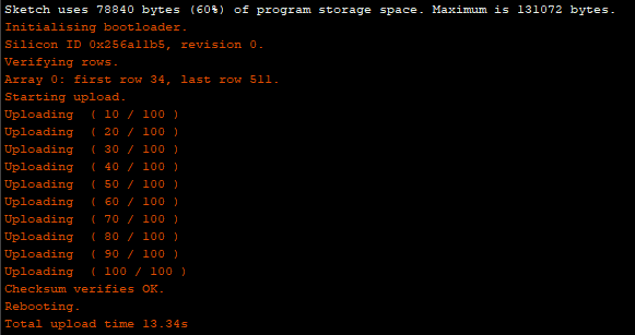 We're finally ready to upload our sketch to the board. In the Arduino IDE, click the right arrow button, or navigate to (Sketch > Upload), to build and upload your new firmware to the board. You should see something similar to the image below at the bottom of your Arduino IDE, when the upload is successful.