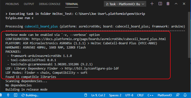 Due to the defines within platformio.ini, PlatformIO can determine the project board and framework dependencies. Any missing dependencies are automatically installed at build time, thus this process may be seen in the build output. This feature allows us to add libraries into our platformio.ini file, which will then be downloaded for us, if needed, at build time.