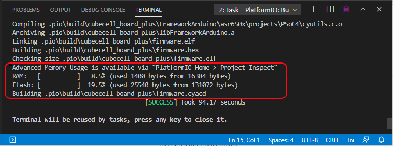 The build process results can be found within the "Terminal View" typically found at the bottom of the VSCode window. Much like with Arduino, the build output will dump the calculated amount of Ram and Flash memory used by your application.