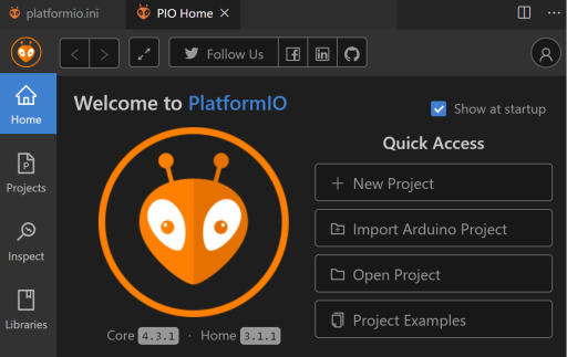 Once PlatformIO is installed, you should be welcomed to VSCode with the following "PIO Home" screen: