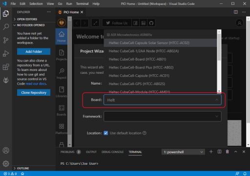 Within the "Board" field select the appropriate target board by entering the name of the manufacturer, "Heltec" for our example. The PlatformIO auto search feature should present you with a known list of supported boards. In our case, we enter "Heltec" and choose the "Heltec CubceCell-GPS (HTCC-AB02S)" from the supplied list.