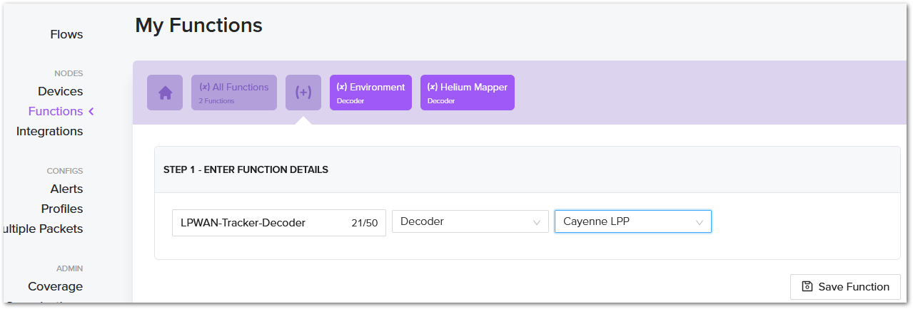 - First, go to Functions in the Helium Console and create a new function. For the name, you can choose anything. The function type needs to be Decoder. For the format, choose Cayenne LPP.