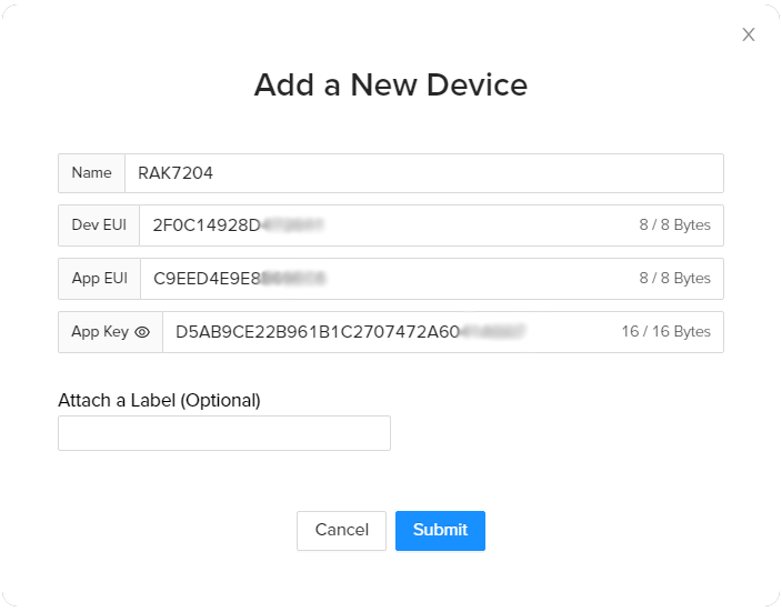 Fill in a name of your choosing. The Dev EUI, App EUI, and App Key will have random values generated for you by default. Press the eye icon to reveal the values. You can manually replace them with values of your own. For this tutorial, default values are used. Press the Submit button, and you are done.
