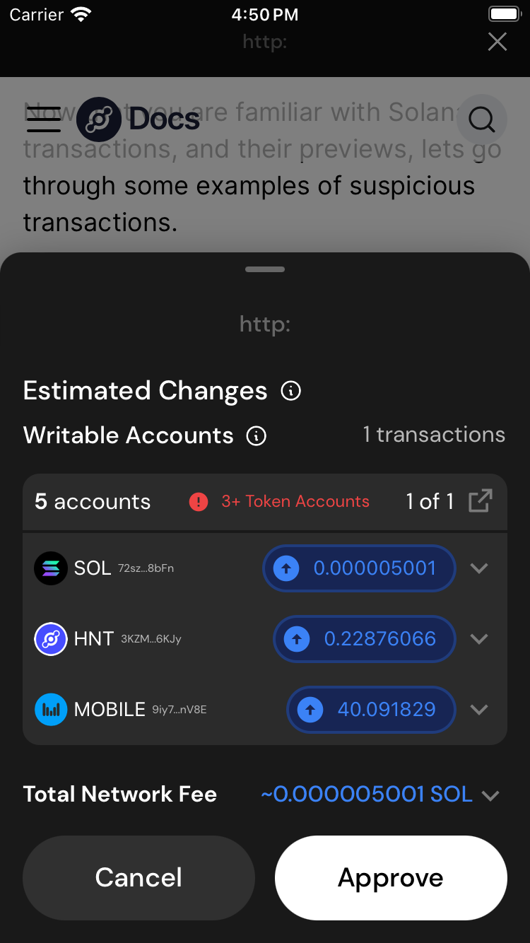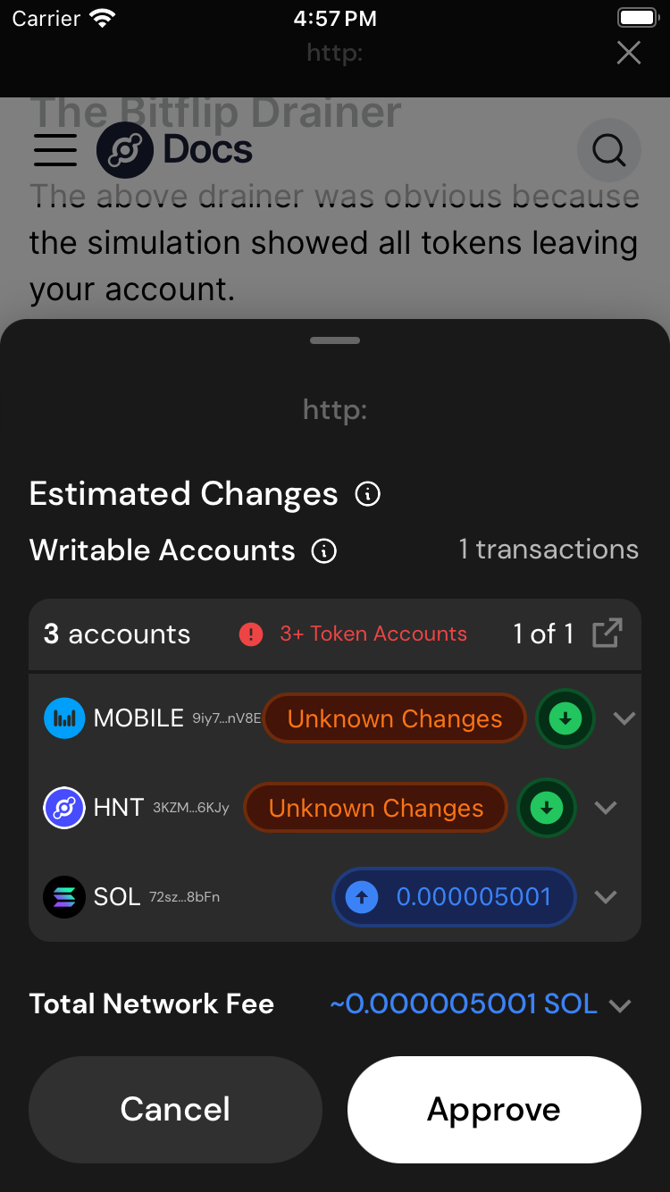 Generally, these transactions will come under the guise of another function. An attacker may claim this transaction will give you free tokens, mint an NFT, or even repair your hotspot. The attacker is lying. If anyone tells you to ignore the transaction preview warnings, they are suspicious.